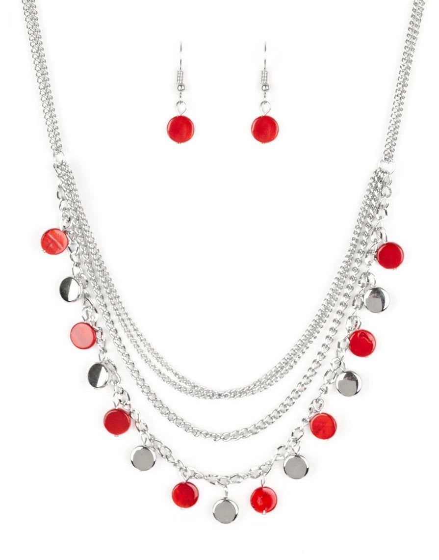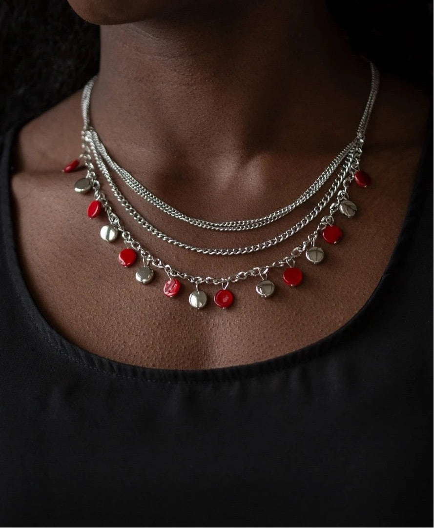 Mismatched silver chains layer below the collar. Shell-like red beads and shiny silver beads trickle from the lowermost chain, creating an iridescent fringe. Features an adjustable clasp closure