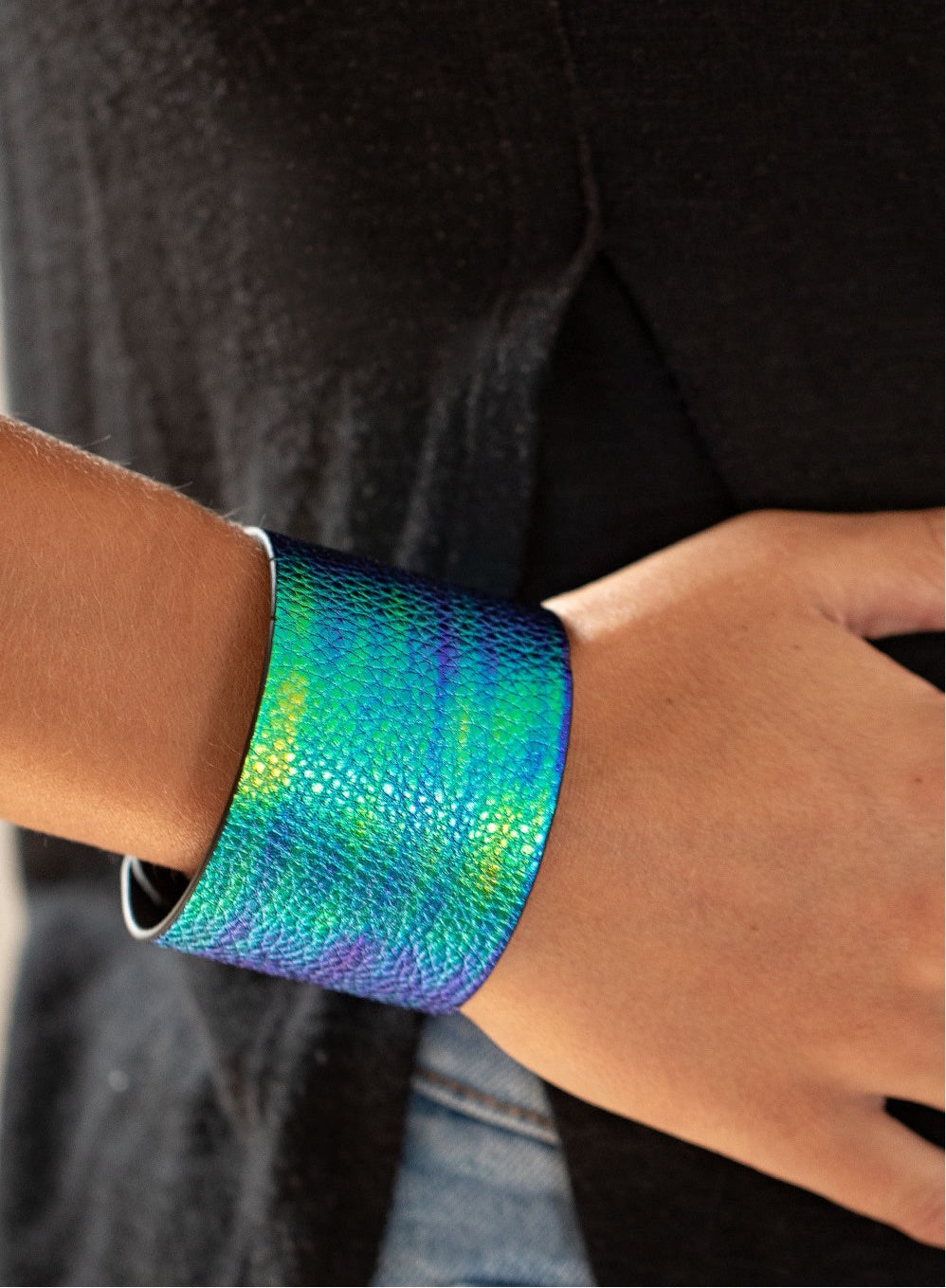 Featuring an iridescent crocodile print, a shimmery blue and green tie-dye leather band wraps around the wrist for an out-of-this-world fashion. Features an adjustable snap closure.