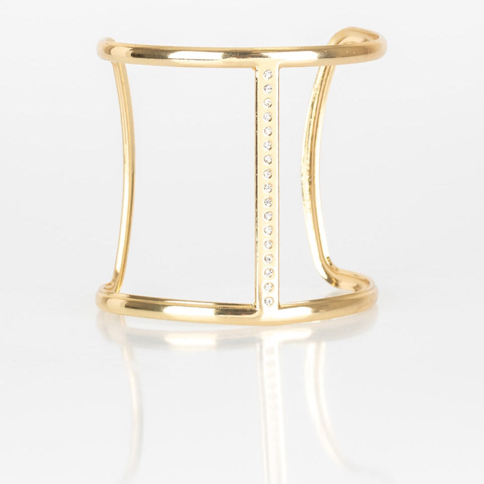 Glassy white rhinestones are encrusted down the spine of an airy gold cuff for an edgy look.