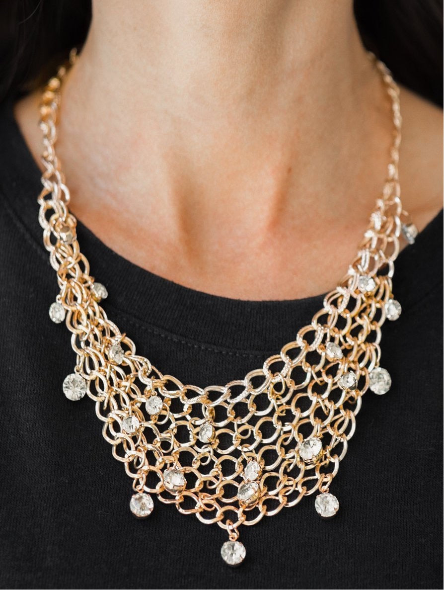 A collar of layered interlocking silver chain provides the canvas for gorgeous clear rhinestones to sway delicately. Features an adjustable clasp closure