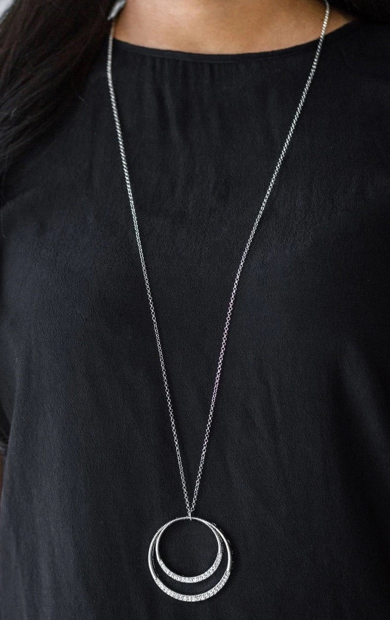 A daring circular pendant swings from the bottom of an elongated silver chain for a refined look. The bottoms of the ornate silver pendant are encrusted in white rhinestones for a glamorous finish. Features an adjustable clasp closure