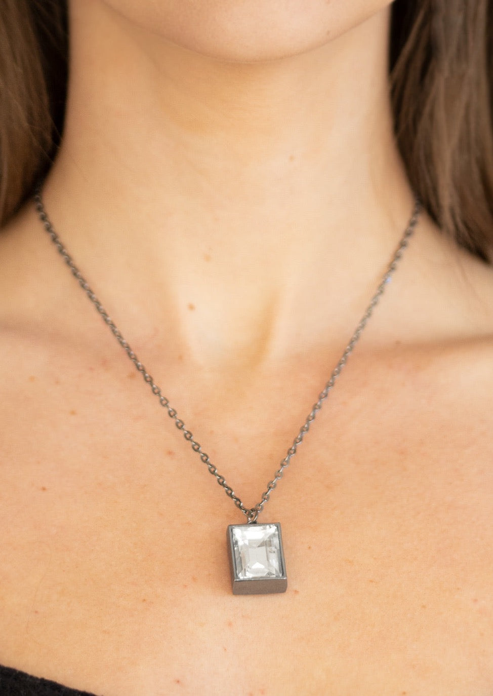 Featuring an emerald style cut, a faceted white gem is pressed into a sleek gunmetal frame at the bottom of a dainty gunmetal chain below the collar for an edgy look. Features an adjustable clasp closure.