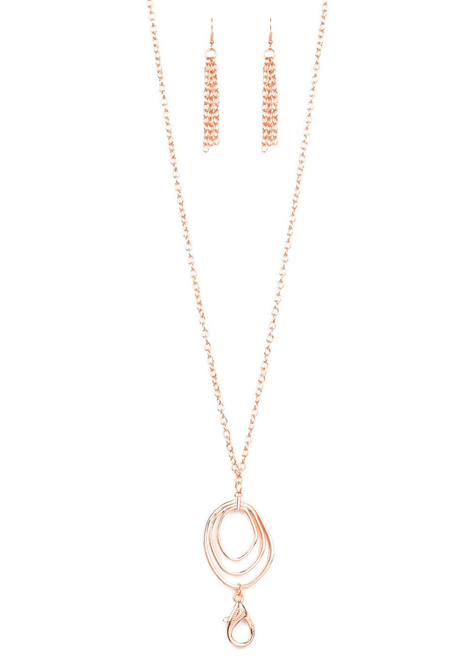 Asymmetrical shiny copper hoops join into an abstract pendant at the bottom of a lengthened shiny copper chain for an industrial flair. A lobster clasp hangs from the bottom of the design to allow a name badge or other item to be attached. Features an adjustable clasp closure.