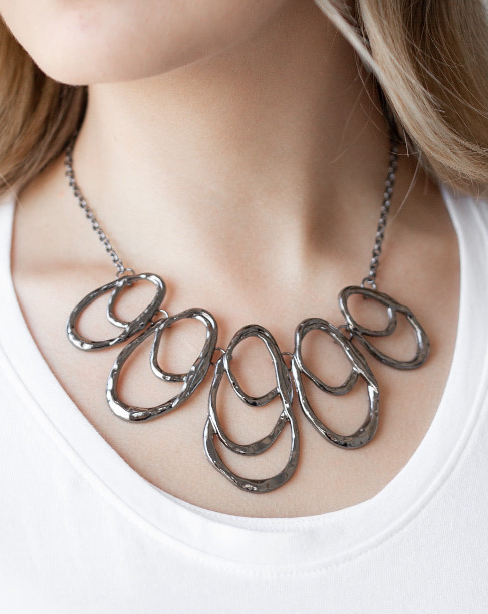 Delicately hammered gunmetal bars overlap into a collection of asymmetrical teardrops below the collar, creating a bold artisan inspired fringe. Features an adjustable clasp closure.